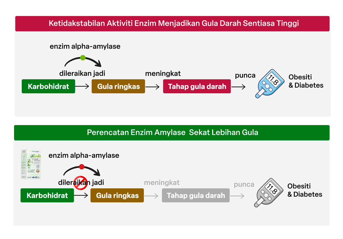 Biokenaf® diformulasi untuk target halang alpha-amylase dari memecahkan karbohidrat kepada gula & hentikan pembentukan lemak & triglycerides di hati.