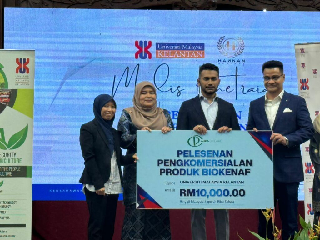 Majlis penyerahan cek perlesesanan pengkormersialan produk Biokenaf® di Universiti Malaysia Kelantan bersama Aura Biocare Sdn. Bhd.